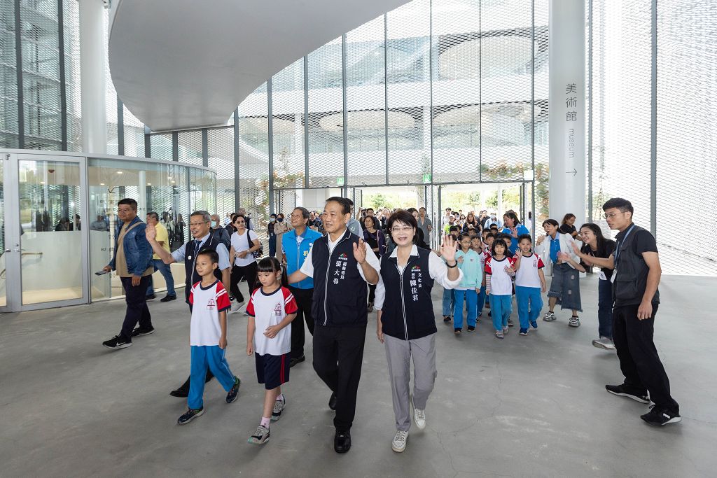 今日試營運首日一早,臺中市政府副秘書長張大春、文化局長陳佳君及建設局長陳大田親臨現場,與圖書館館長曾惠君、美術館館長賴依欣,以溫馨的開門儀式共同揭開序幕,邀請民眾入館。新興國小二年級的小朋友也在老師帶領下率先入館,現場洋溢著歡笑與活力,共同見證這座文化新地標的啟用。兩館並準備限量綠美圖文創品贈送給首批入館民眾,並於社群舉辦「打卡抽珍藏禮」活動,邀請市民親臨現場,感受美術館的藝術能量與圖書館的知識魅力,體驗文化交融的嶄新空間。