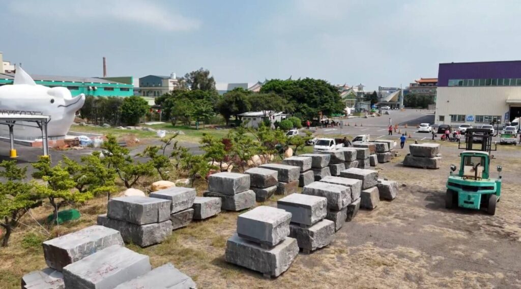 圖:柬埔寨台商林家民董事長捐贈重達400公噸的花崗石,將提供玻璃廟於廟後方堆疊成1.5公尺寬3公尺高近60公尺長的巨石擋風牆
