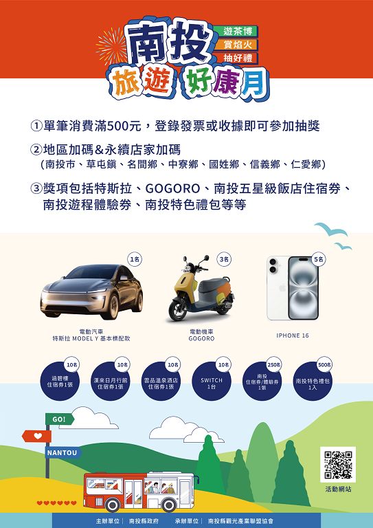 南投縣政府觀光處表示,尚未中獎的民眾不必氣餒,只要在11月15日前於南投合法店家單筆消費滿500元,憑發票或收據登錄即可參加抽獎。後續將陸續抽出特斯拉電動汽車、Gogoro電動機車、iPhone、Switch、五星級住宿券等豐富獎項。