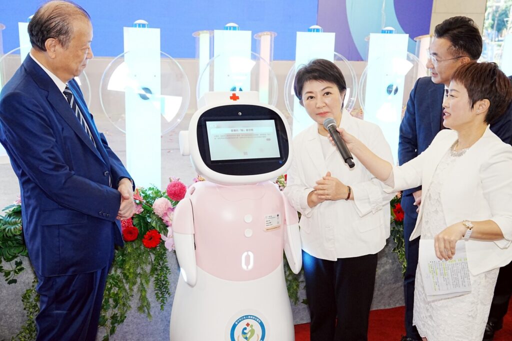 圖:中醫大暨醫療體系董事長蔡長、臺中市長盧秀燕(右二)與「愛寶機器人」進行問答互動