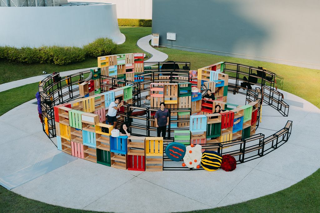 NTT《綠動樂園—花園迷宮探險趣》_圓形迷宮由可完全回收的鐵管與木箱堆疊構成,小徑以自然迴旋方式設計,搭配不同高度的層架,讓全齡參觀者都能自由探索。©臺中國家歌劇院