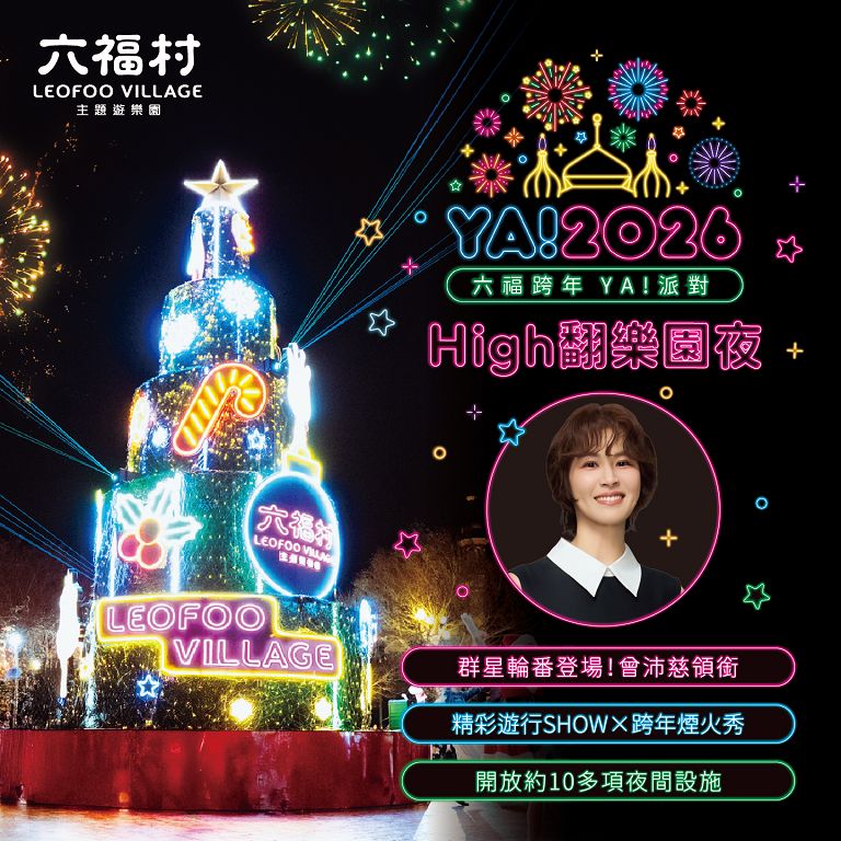 年末壓軸活動將於 12 月 31 日 登場,六福村推出「六福跨年 YA!派對 High 翻樂園夜」,邀請影歌雙棲女神、國民姊姊 曾沛慈 現場開唱,並施放長達 5 分鐘的跨年煙火秀,陪伴遊客倒數迎接 2026 年。為方便遊客參與跨年活動,六福旅遊集團也特別於跨年夜加開台北往返六福村接駁專車,自白天一路服務至跨年後凌晨,提供多班次接送,實際抵達時間將依當日交通狀況彈性調整,讓民眾安心盡情狂歡。