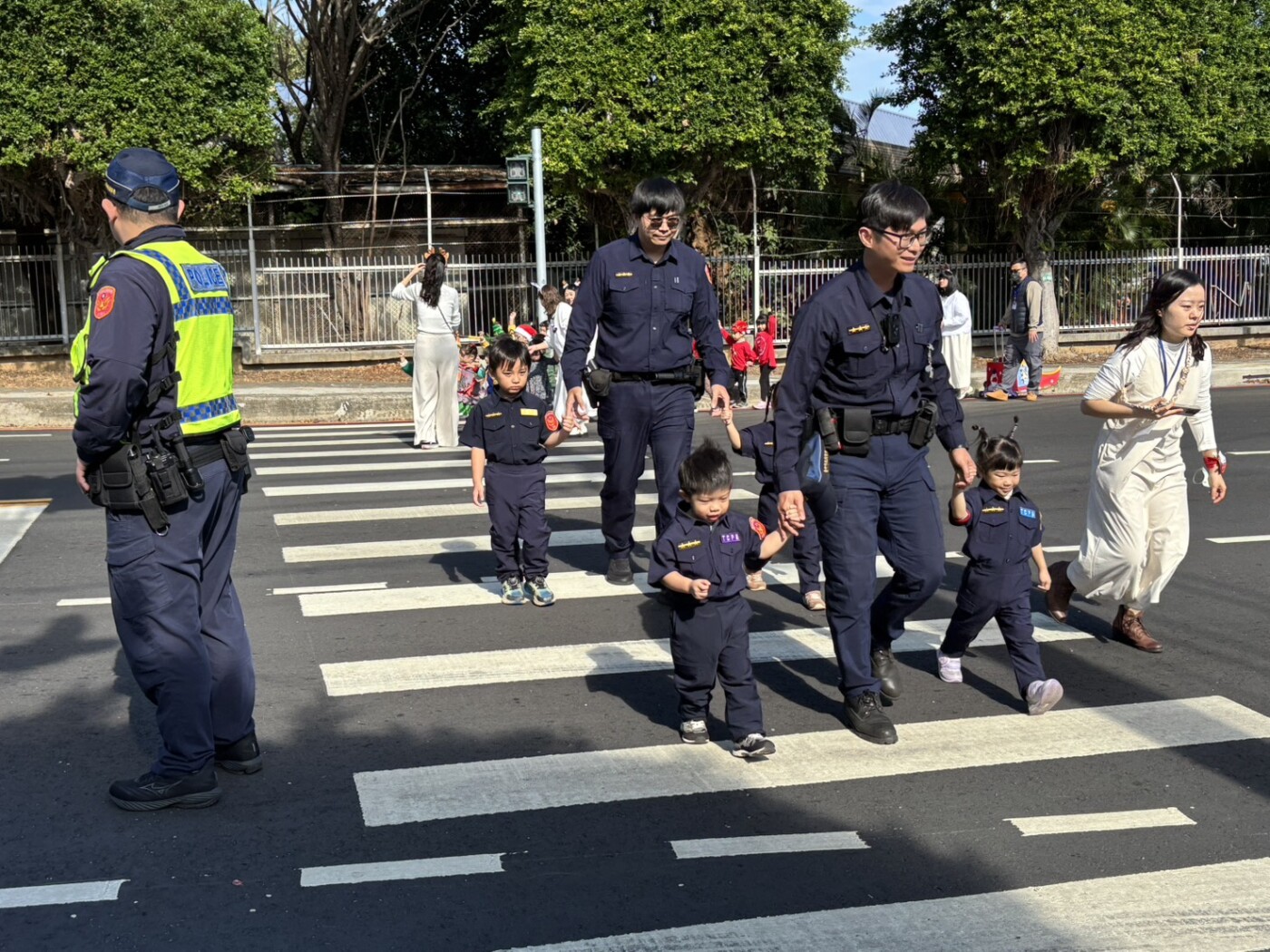 活動過程中,幼兒隊伍需行經車流頻繁的路口,第六分局工業區派出所員警主動出面協助交通指揮,並貼心地「一手牽著一名小朋友」,陪伴孩子安全通過斑馬線,全程守護不鬆手。員警專注守護的畫面,讓在場老師與家長深受感動,也讓孩子們在真實互動中,感受到警察守護社會與人民的溫暖力量。