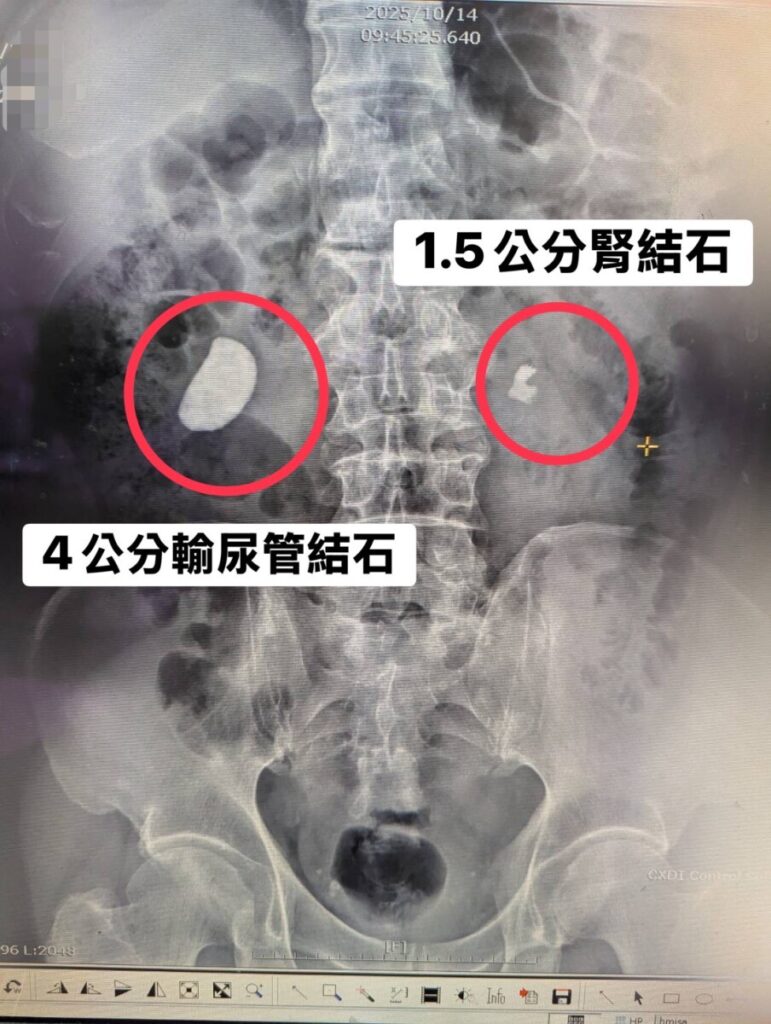 衛生福利部臺中醫院泌尿科簡維弘醫師指出,患者接受X光檢查時,明顯可見右側輸尿管與腎臟交界處卡著一顆約4公分的巨大結石,左腎也另有一顆約1.5公分的結石,造成雙側腎水腫,出現腰痛與血尿等典型症狀。「輸尿管直徑約0.5公分,卻卡住一顆4公分結石,臨床上相當少見,患者竟然只以腰痠腰痛表現,幸好因血尿及時就醫,否則恐造成不可逆的腎功能損傷。」為保護腎臟功能,院方立即安排右側輸尿管取石手術,並同步進行左腎體外震波碎石治療,以緩解腎水腫狀況。