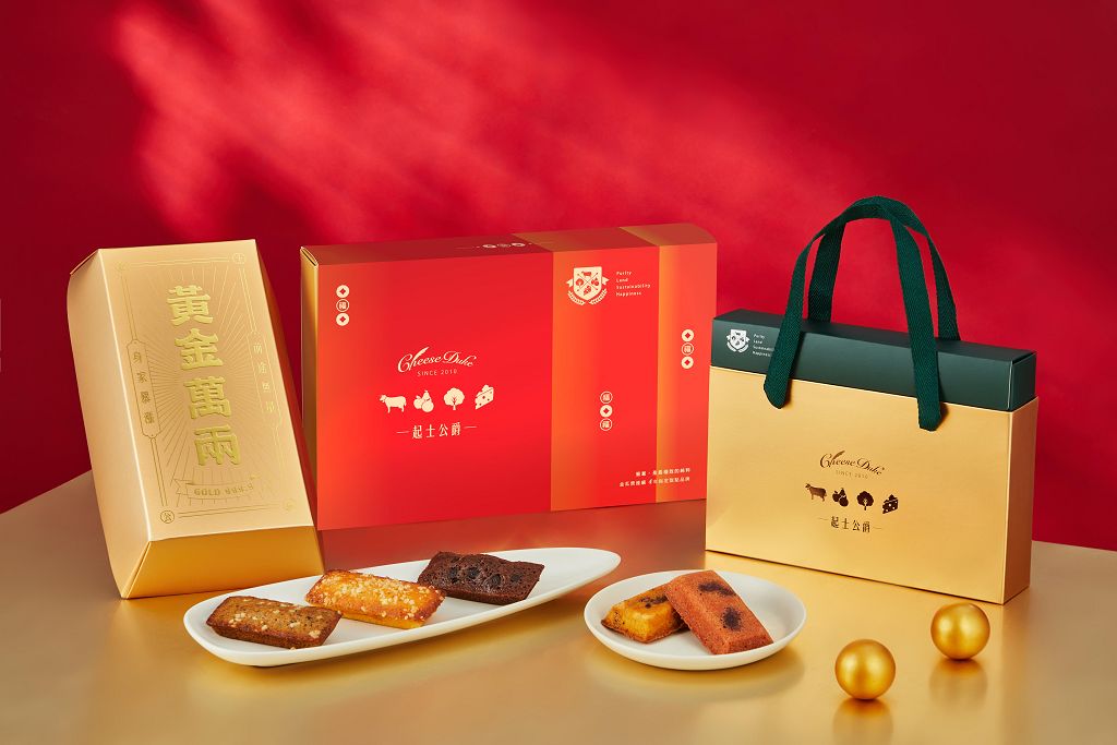 象徵財富與祝福的「法式費雪禮盒」同樣是春節送禮亮點。費雪起源於 19 世紀法國金融街,外型如金磚,被視為吉祥甜點。起士公爵推出 4 入、5 入與 8 入禮盒,其中 5 入「黃金萬兩」造型特別吸睛,口味包含黑松露、乳酪、鳳梨、草莓與柑桔,不靠重油也能保持濕潤口感,長輩與孩子都適合。