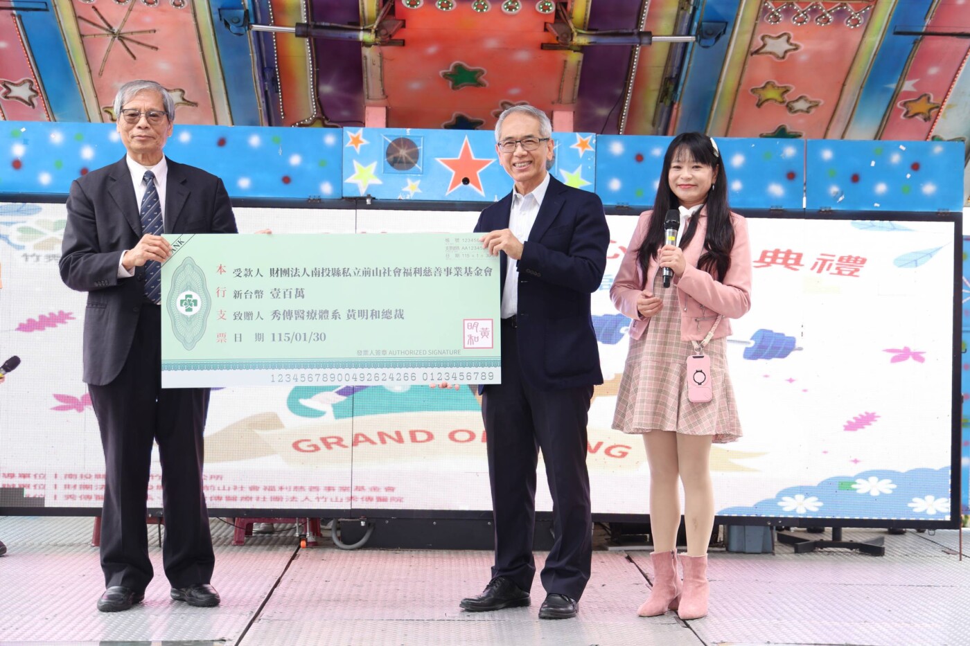 開幕典禮由竹山秀傳醫院院長莊碧焜主持,縣府社會及勞動局團隊、縣議員蔡孟娥、陳玉鈴、竹山鎮長陳東睦及多位地方代表、里長與民眾到場共襄盛舉。秀傳醫療體系名譽院長陳進堂亦代表總裁黃明和,捐贈新台幣 100 萬元給前山基金會,協助充實日照中心設備,強化在地長照服務量能。