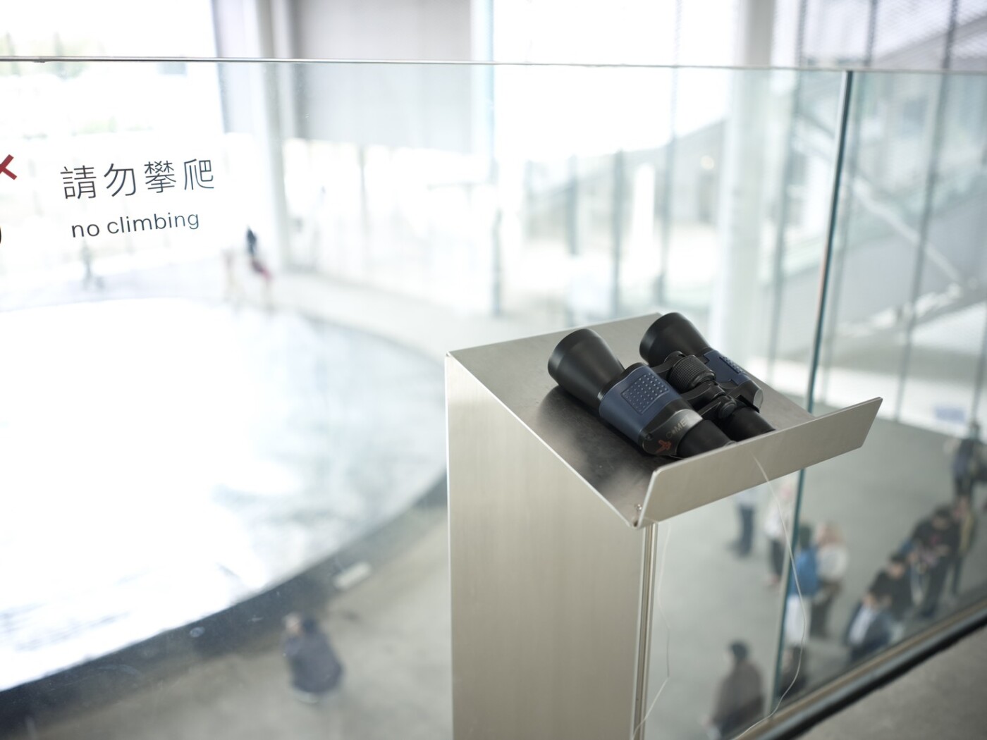 連接美術館與圖書館的二樓連通橋設有一支望遠鏡,低頭可俯瞰大廳人流,捕捉建築中流動的節奏