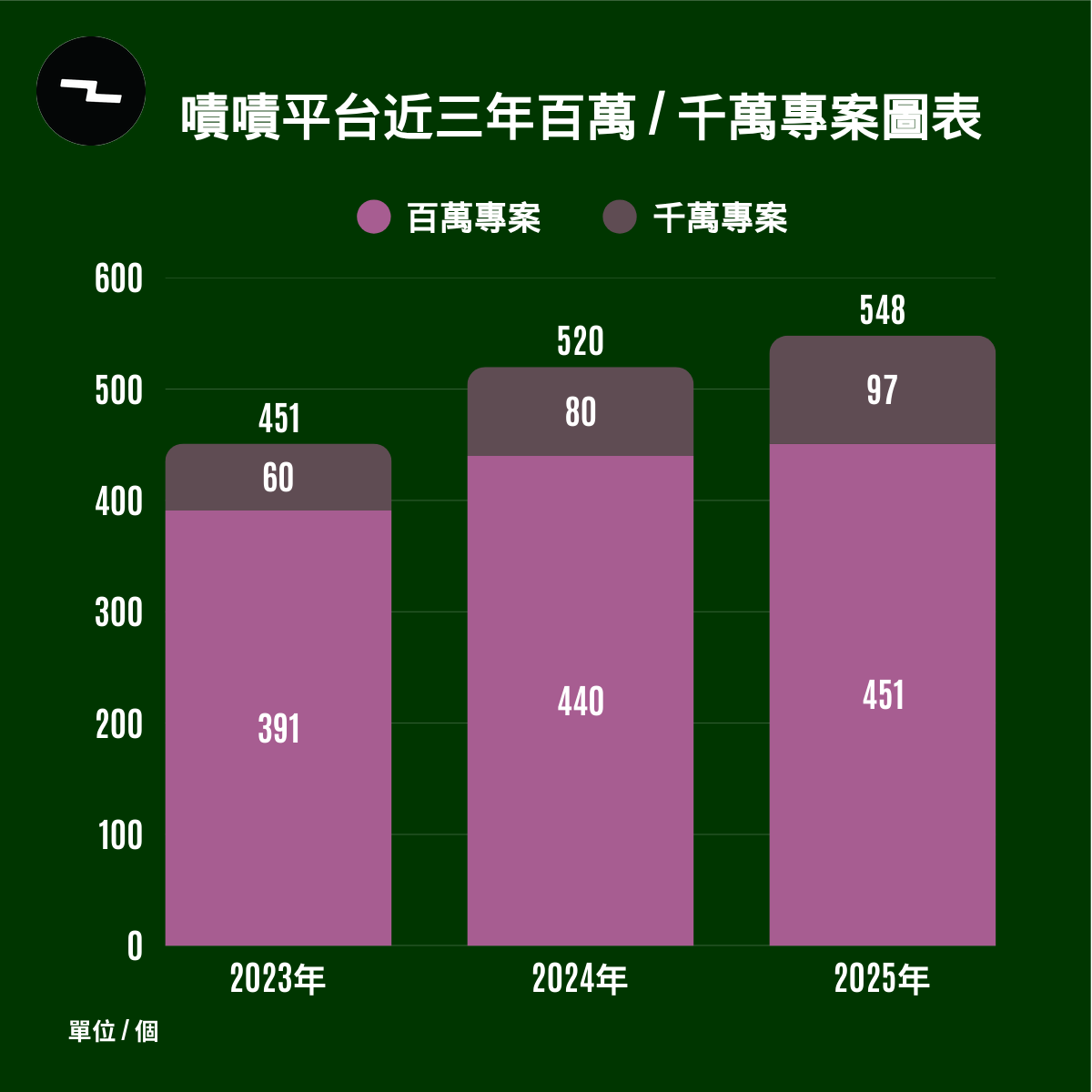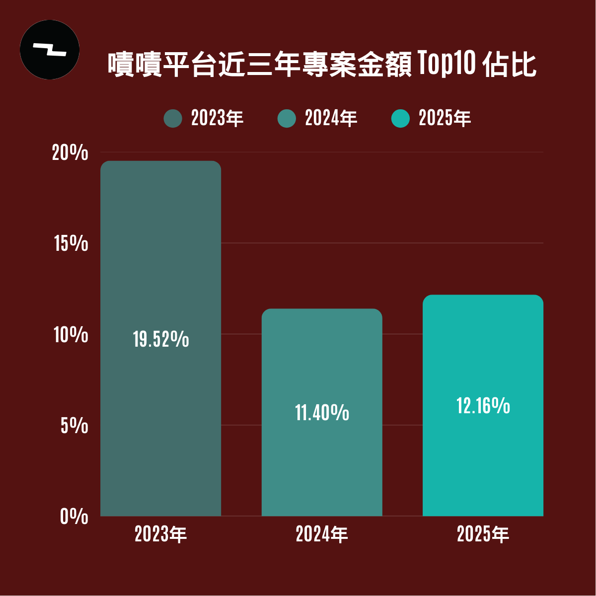 近三年最明顯轉變,在於對「少數爆款」的依賴下降。2023 年前十大專案金額占比近兩成,2024、2025 年降至 11%–12%。同時,百萬級專案從 391 件增至 451 件,千萬級專案由 60 件增至 97 件,顯示平台結構由尖塔型轉為更健康的「梯形」分布,中大型案件成為穩定動能。