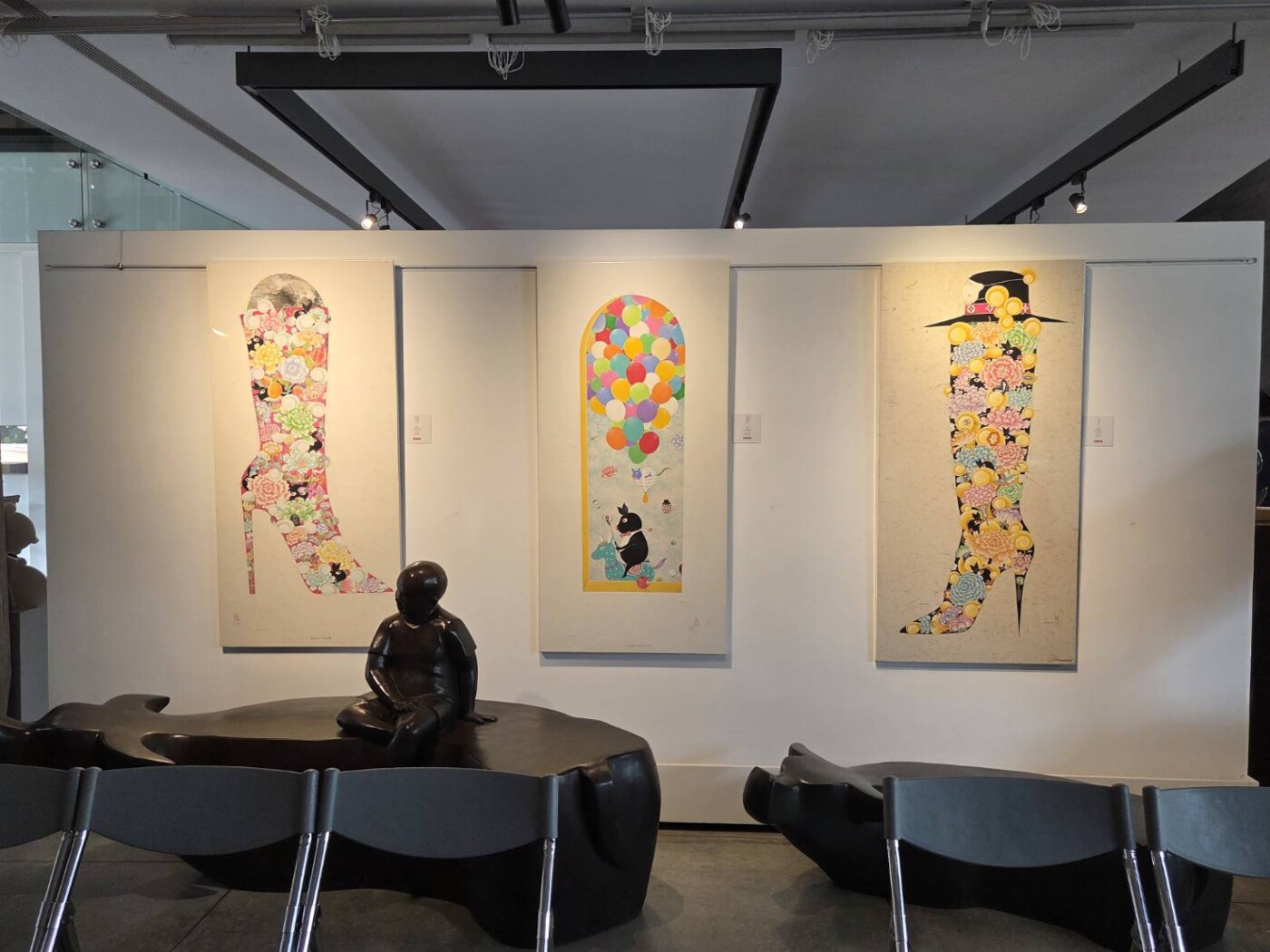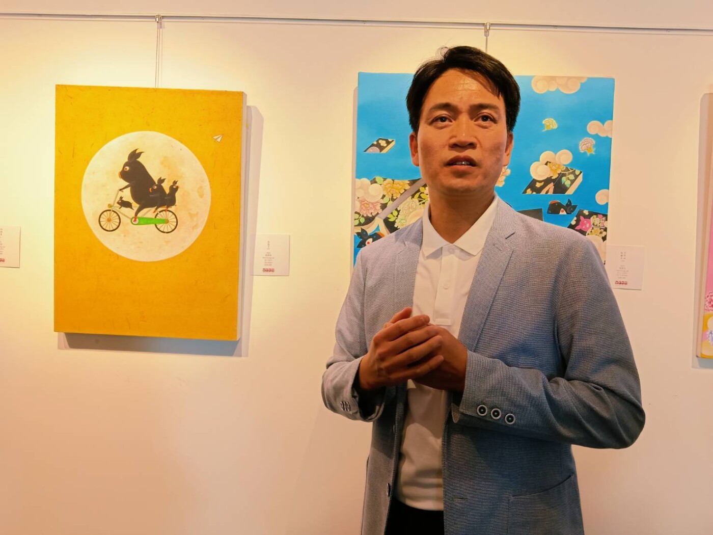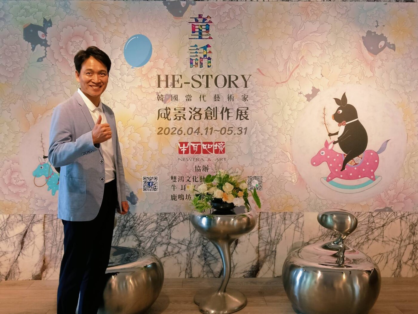 於是,畫布上那些穿梭於牡丹花叢、手執花枝的黑豬紳士,不再只是藝術符號。咸景洛以傳統工筆畫法為底,巧妙地加上複合素材的拼貼,讓黑豬的形象更顯立體時髦。這種融合傳統工藝與現代拼貼的手法,這場特展不僅展現了「新東方主義」的匠心,更觸動了每個人心中最柔軟的角落。