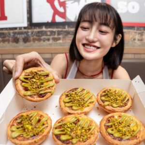 即將推出的「開心果脆粒蛋撻」不僅承襲了先前在香港爆紅的話題靈魂,更在港版雙層結構上加碼創新,打造全台首發的「夢幻三層美味連動」,獨家加入超柔滑開心果慕斯層,搭配在濃郁奶蛋香中,包裹著驚喜的開心果流心內餡、灑上開心果脆粒,加乘「三層爆擊」的精品級口感層次,要搶攻2026年度開心果控不可錯過的質感甜點美味。
