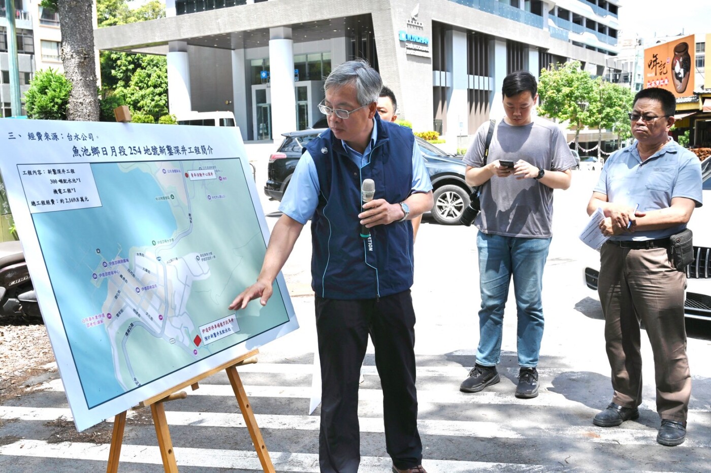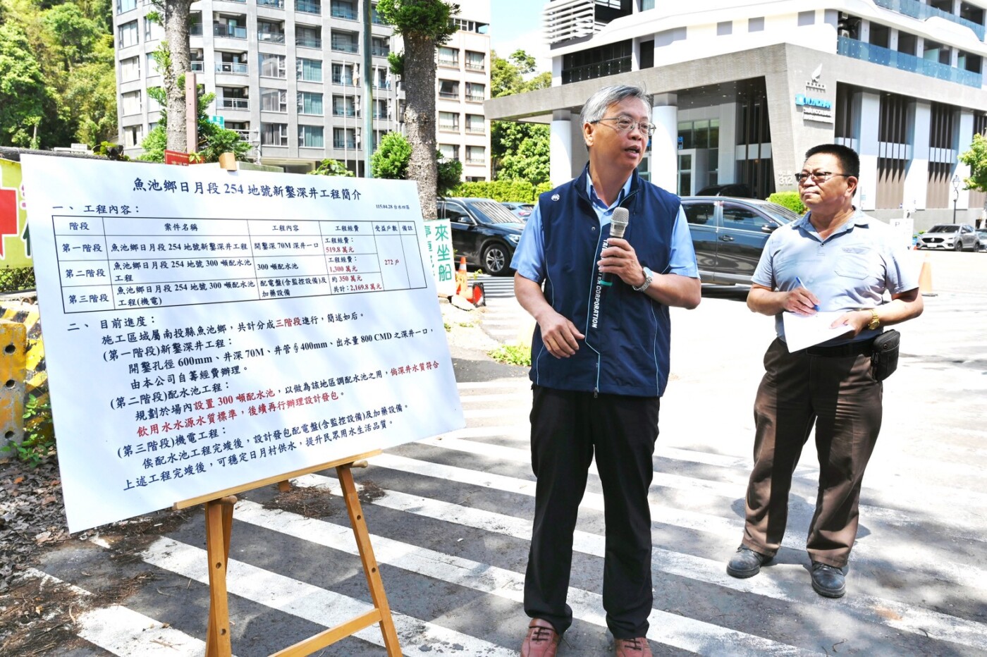 本次規劃工程將分三階段推動:第一階段於伊達邵停車場後方新鑿70公尺深井;第二階段設置300噸配水池,作為區域調配與穩壓使用;第三階段辦理機電設備、監控系統及加藥設備建置。待工程完成後,將可有效提升供水調節能力,穩定日月村整體供水系統。