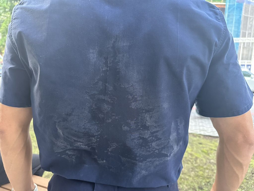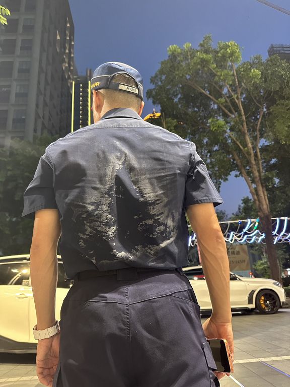 中市警六分局員警在百貨商圈附近頂著烈日執勤,汗水結晶宛如「鹽值爆表」。